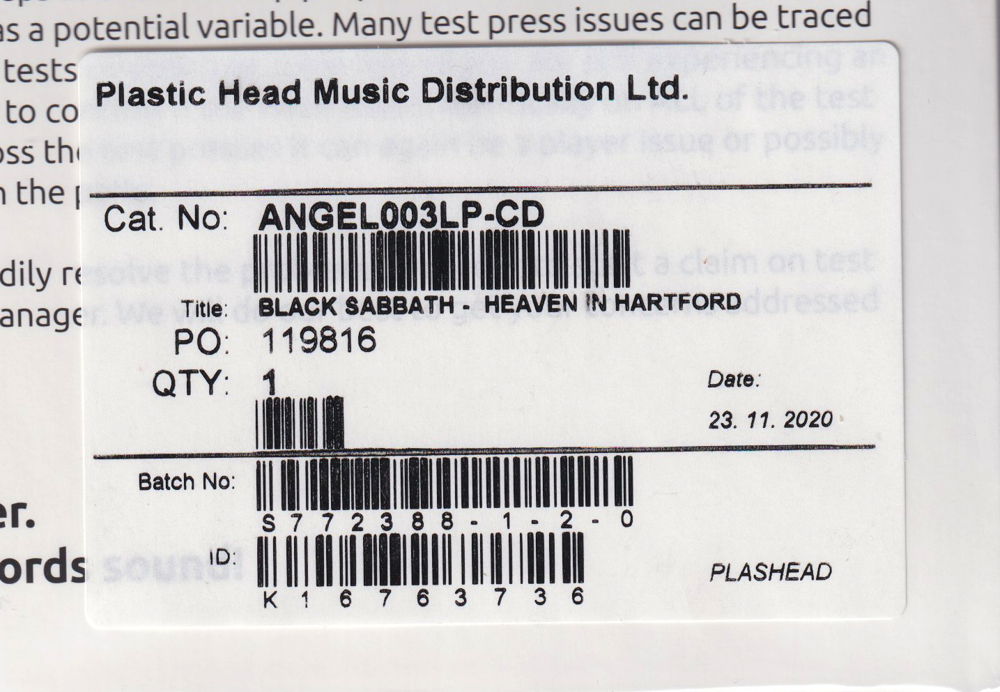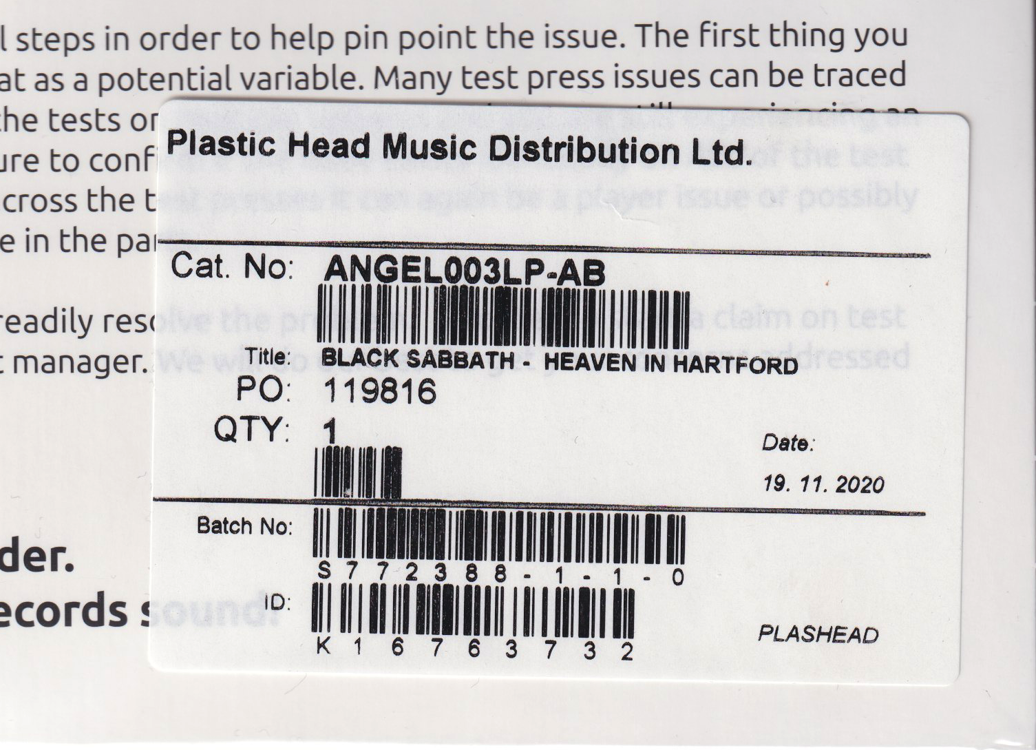 printed (typed text) on the run-off area of the vinyls
