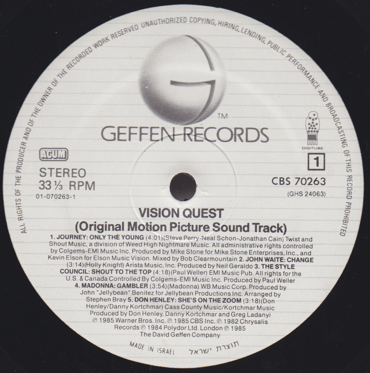 - Geffen/CBS Records CBS 70263, Israel, 1985