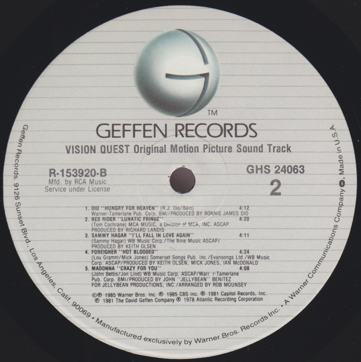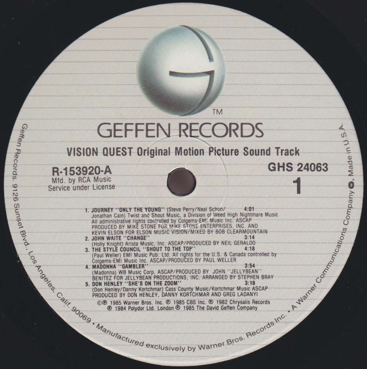 - Geffen/RCA Music Service R-153920 (GHS 24063 E), USA, 1985