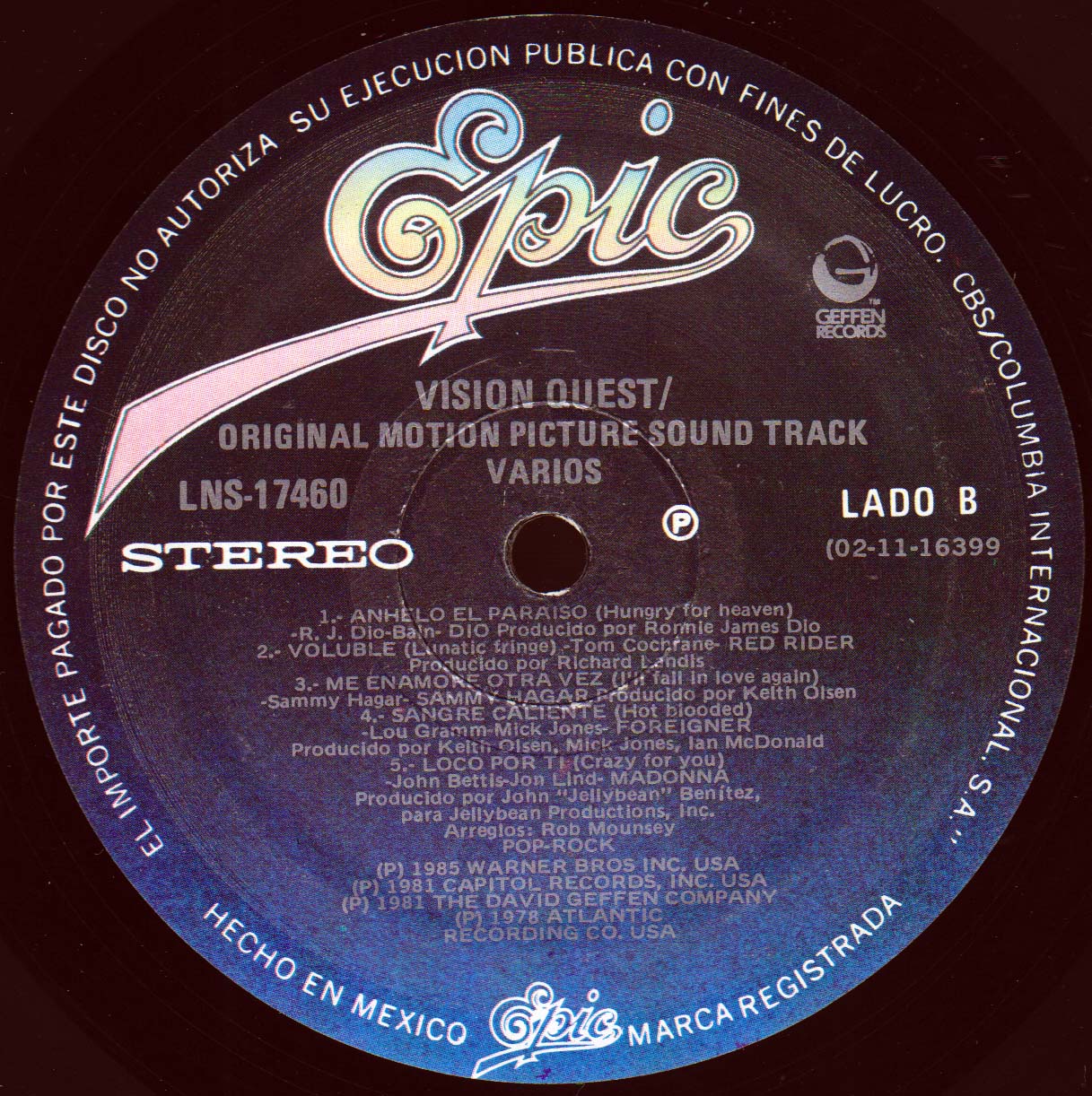 - Epic/Geffen LNS-17460, Mexico, 1985