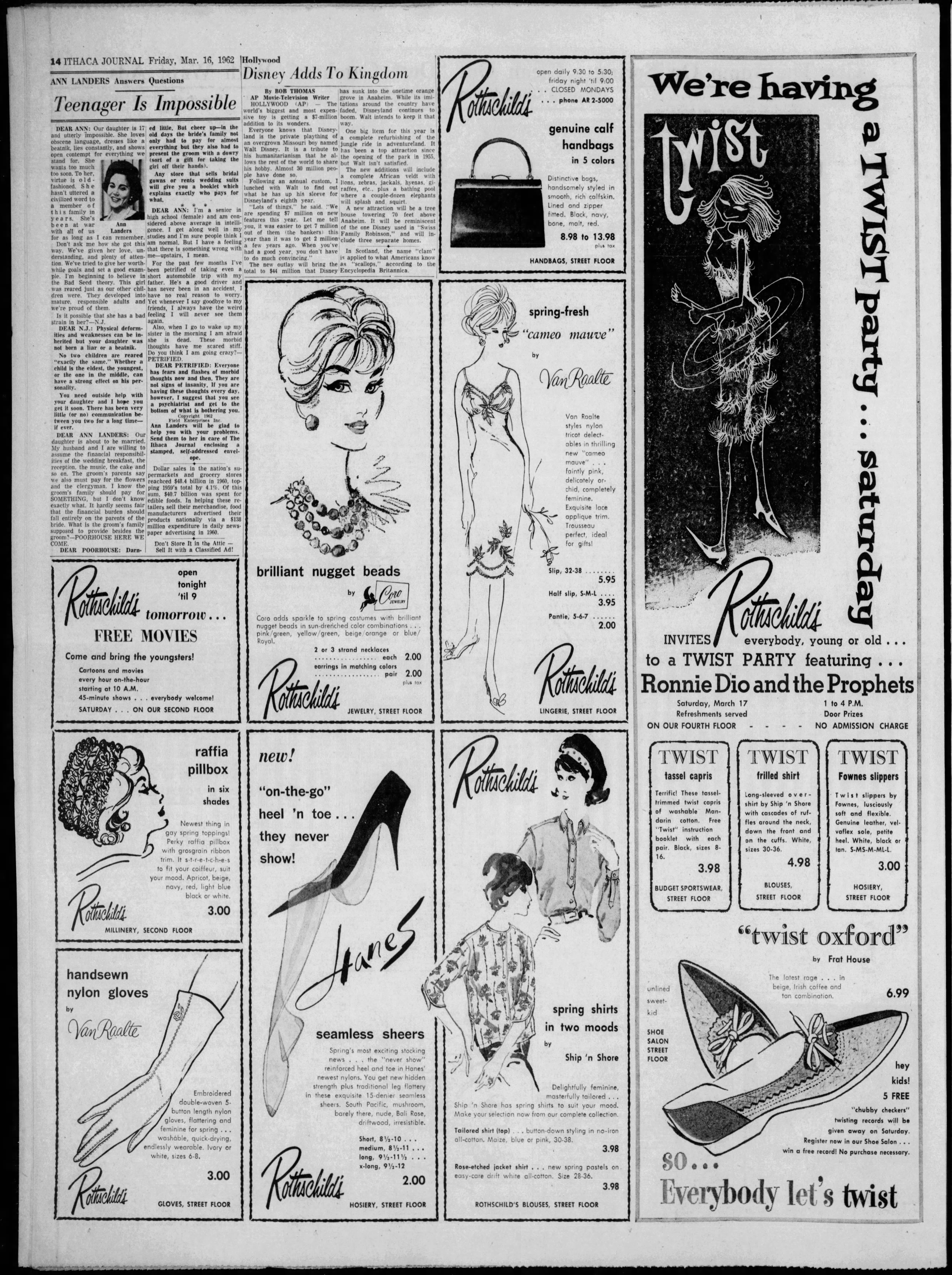 | 1962-03-17 | Rothschild's Department Store - 4th Floor | Ithaca, NY | USA | Ronnie Dio and the Prophets | Click here for gig ad from 1962-03-16 The Ithaca Journal newspaper. | |