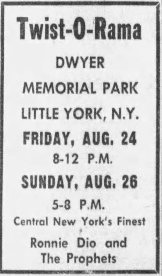 | 1962-08-24 | Dwyer Memorial Park | Preble, NY | USA | Ronnie Dio and the Prophets | Click here for gig ad from 1962-08-22 Cortland Standard newspaper.