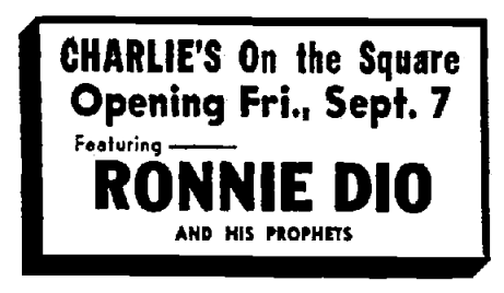 | 1962-09-07 | Charlie's On The Square | Utica, NY | USA | Ronnie Dio and the Prophets | Advertised as "Ronnie Dio And His Prophets"