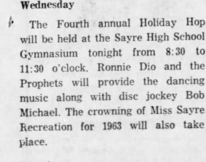 | 1962-12-26 | Sayre High School Gymnasium | Sayre, PA | USA | Ronnie Dio and the Prophets | 400 people in audience. Ronnie was one of the judges for the Miss Sayre Recreation selected at this event.