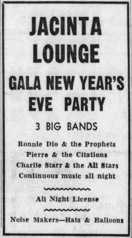 Ronnie Dio and the Prophets, The Cindells, Johnny And The Playboys and The Cavaliers played at the venue on December 22nd, 23rd, 25th, 27th, 29th and 31st, but no exact dates for the separate bands are given in the advertisement.